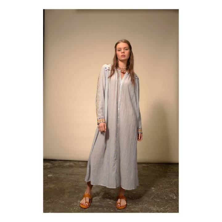 - Semi-transparent, Long sleeves, Side pockets, Wide sleeves, Embroidery, Buttoned collar